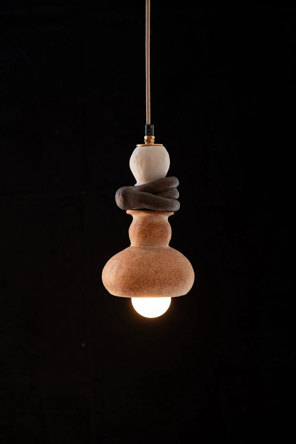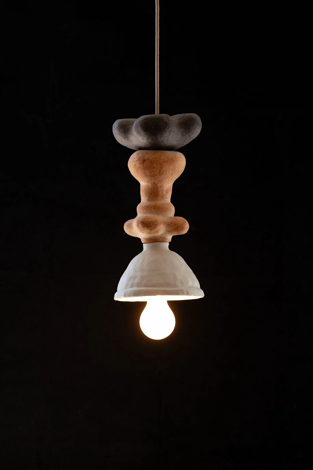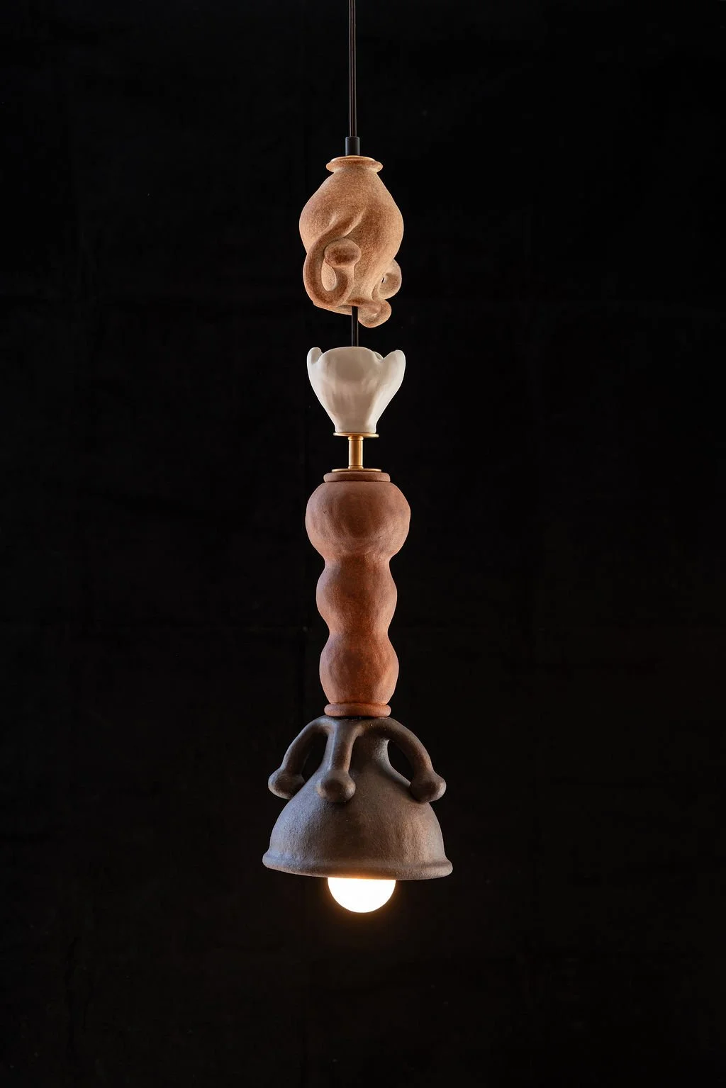 Exquisite Corpse is a sculptural lamp composed of four different clay bodies and over 20 interchangeable beads *only a few on view*. Inspired by flower parts and the shapes and forms in mutualistic pollinator plant relationships. Named after the 19th century French Parlor game Exquisite Corpse, I created each part without seeing the next, creating a whole image or “corpse” revealed in the end.